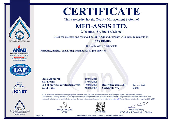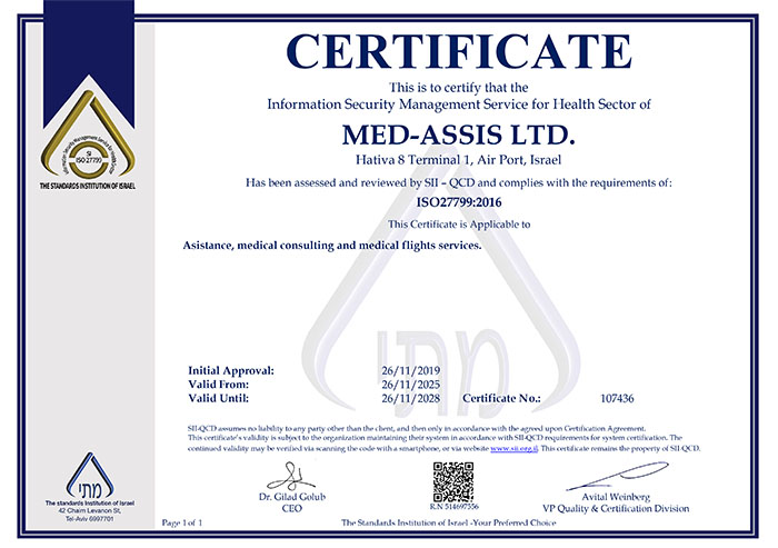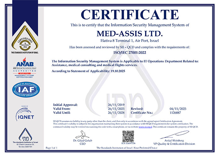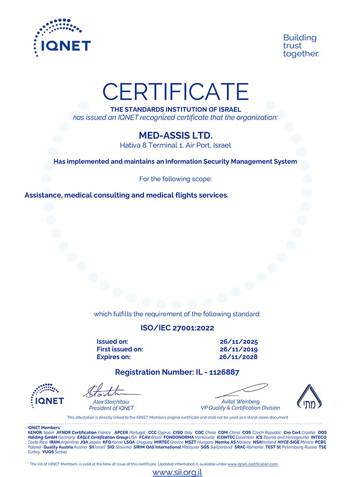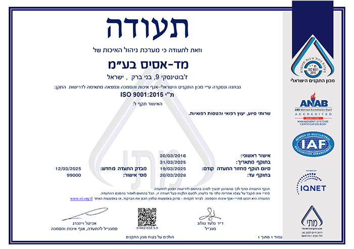 Medassis is ISO 9001 and ISO 27000 certified, ensuring high-quality service and continuous improvement to meet customer and global standards, as confirmed by the Israeli Standards Institute.