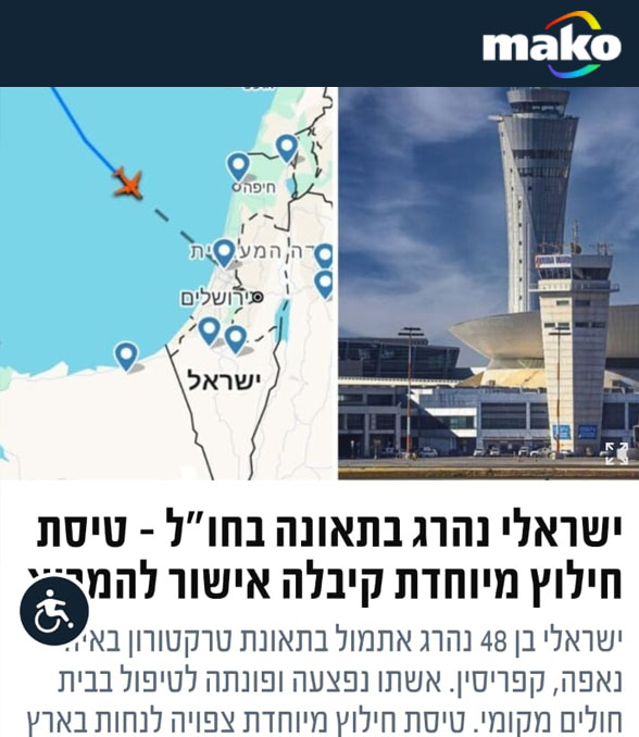 "חברת מדאסיס הטסות רפואיות וסיוע רפואי לישראלים השוהים בחו"ל הוציאה, בשירות חברת הביטוח כלל ביטוח ופיננסים, אמבולנס אווירי עם צוות רפואי טיפול נמרץ המורכב מרופא טיפול נמרץ בכיר ופרמדיק להבאת פצועי התאונה לארץ. …"